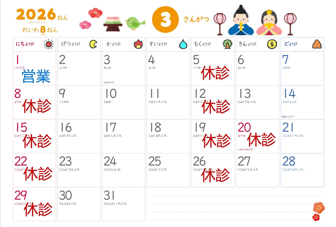 3月は3/1日曜日が診療日となります‼️